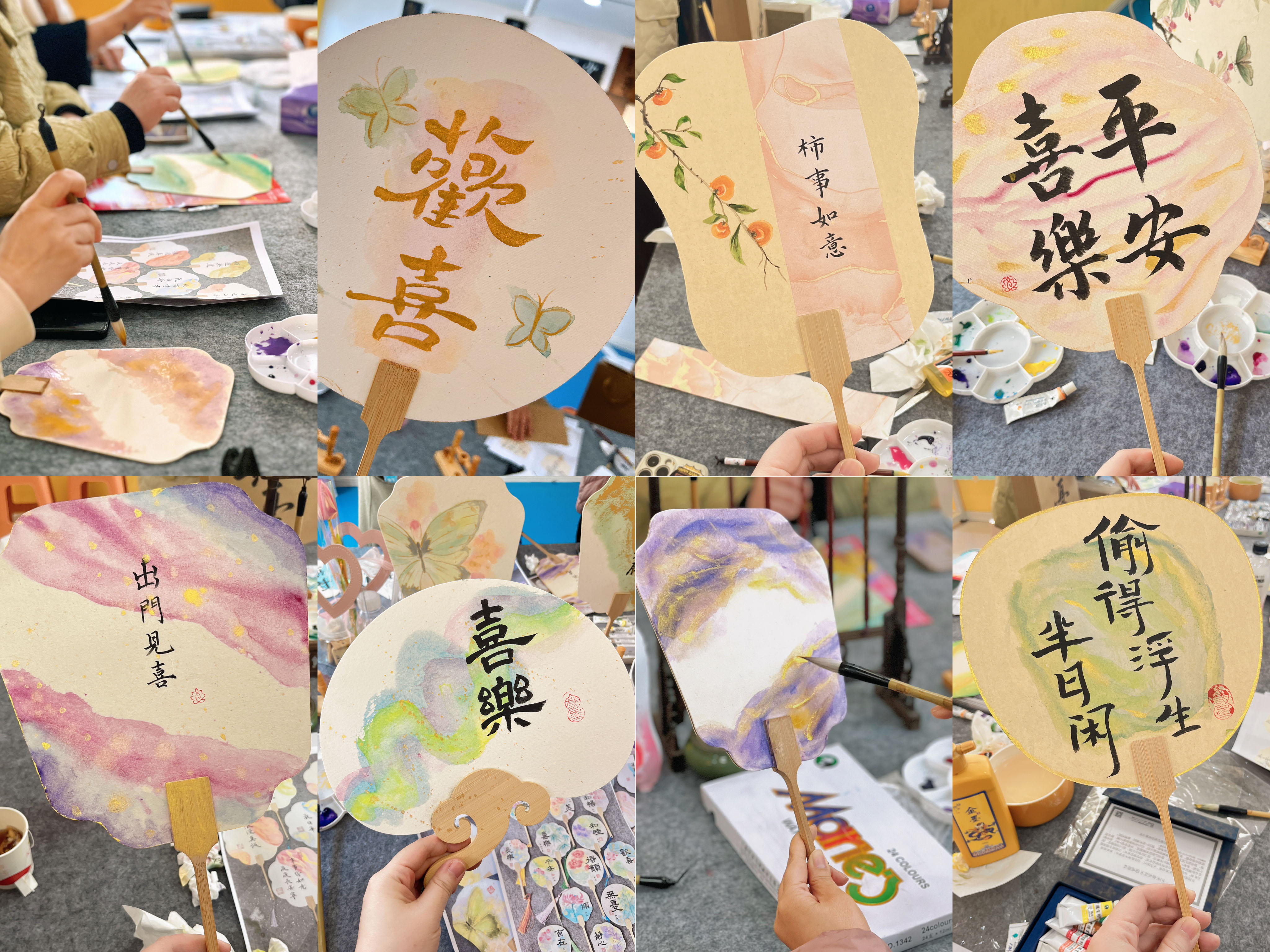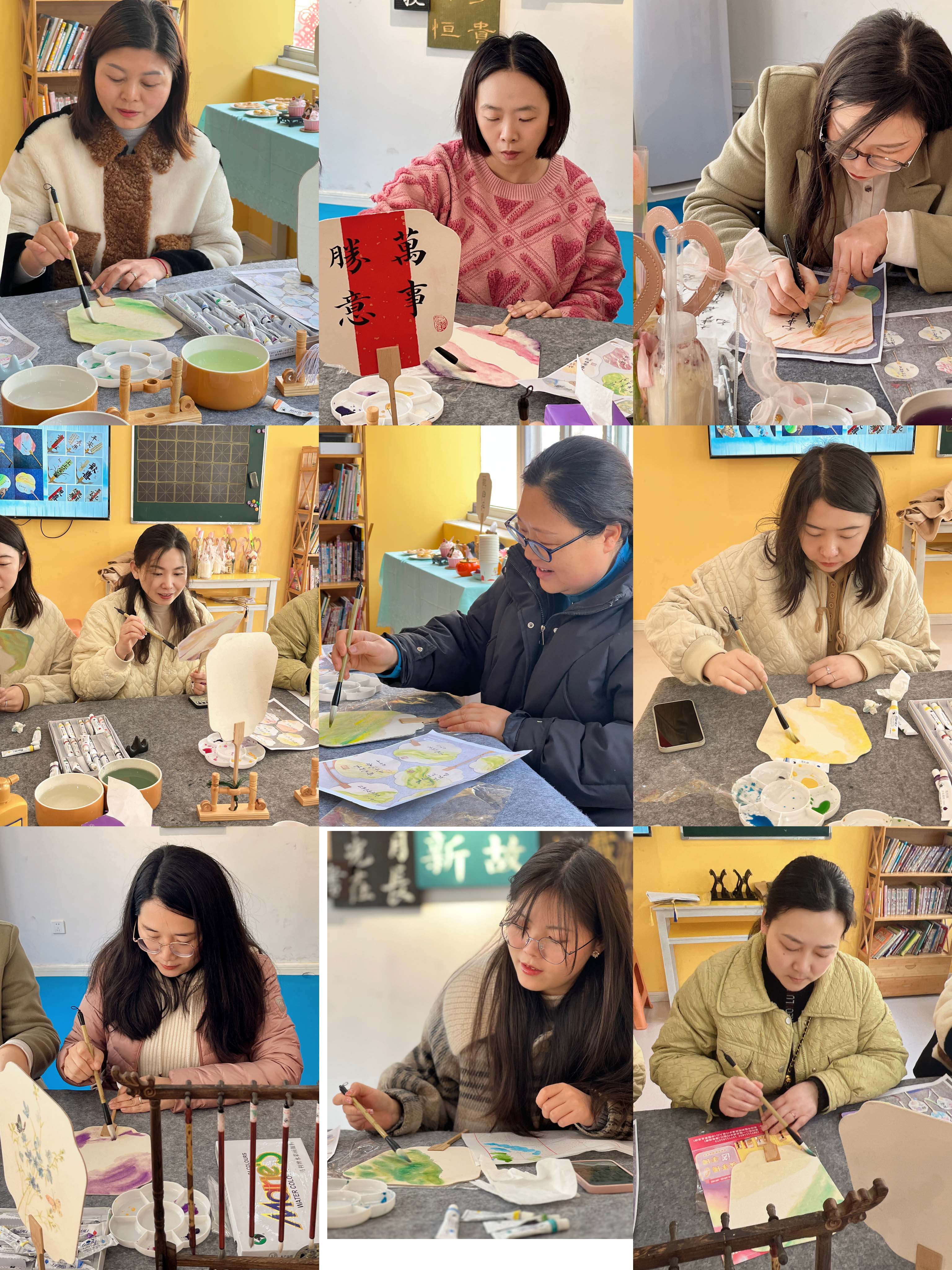 活動(dòng)開始前,老師先向大家介紹了團(tuán)扇的文化背景及制作方法。隨后向大家發(fā)放了空白扇子、毛筆和顏料等各種輔料工具。大家躍躍欲試,白描、運(yùn)筆、上色,忙得不亦樂乎;顒(dòng)中大家熱情高漲,相互借鑒學(xué)習(xí),現(xiàn)場(chǎng)充滿歡聲笑語(yǔ)。原本一片空白的團(tuán)扇,在大家精心制作下變成了一把把色彩斑斕的“藝術(shù)品”。